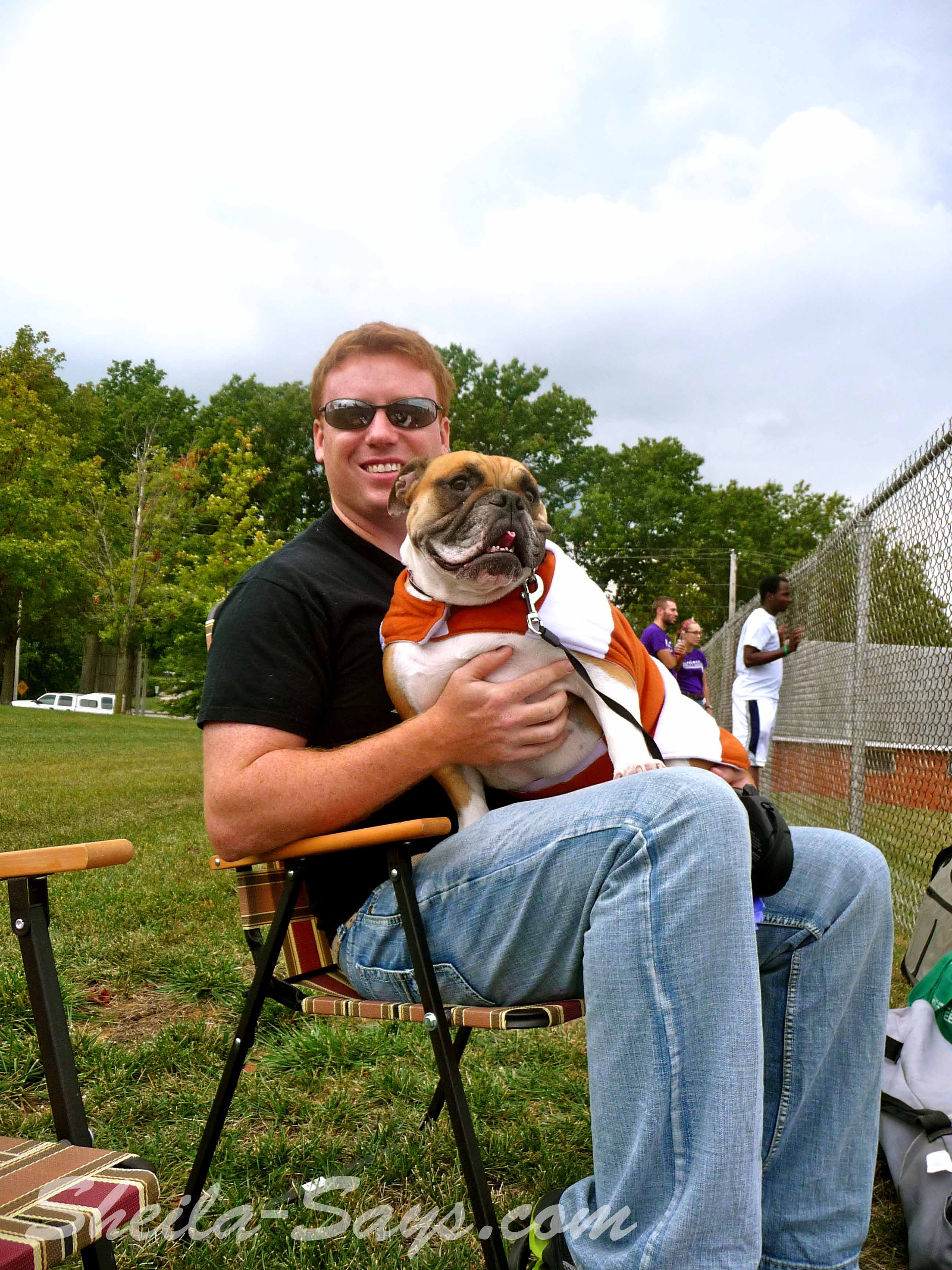 That would be my husband, Mike, and our English Bulldog, Beatrice. And yes, Beatrice is wearing her football costume. She hates to go to events underdressed.